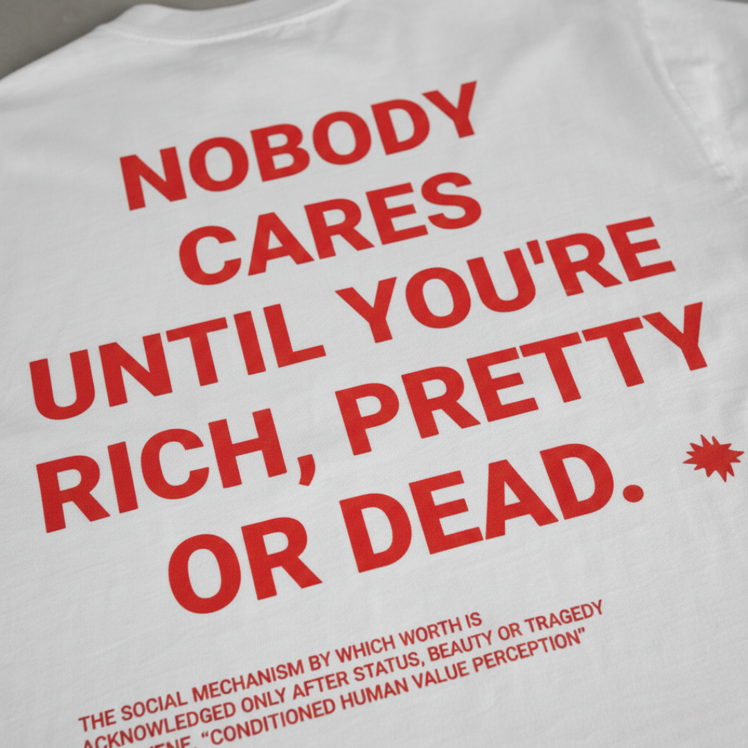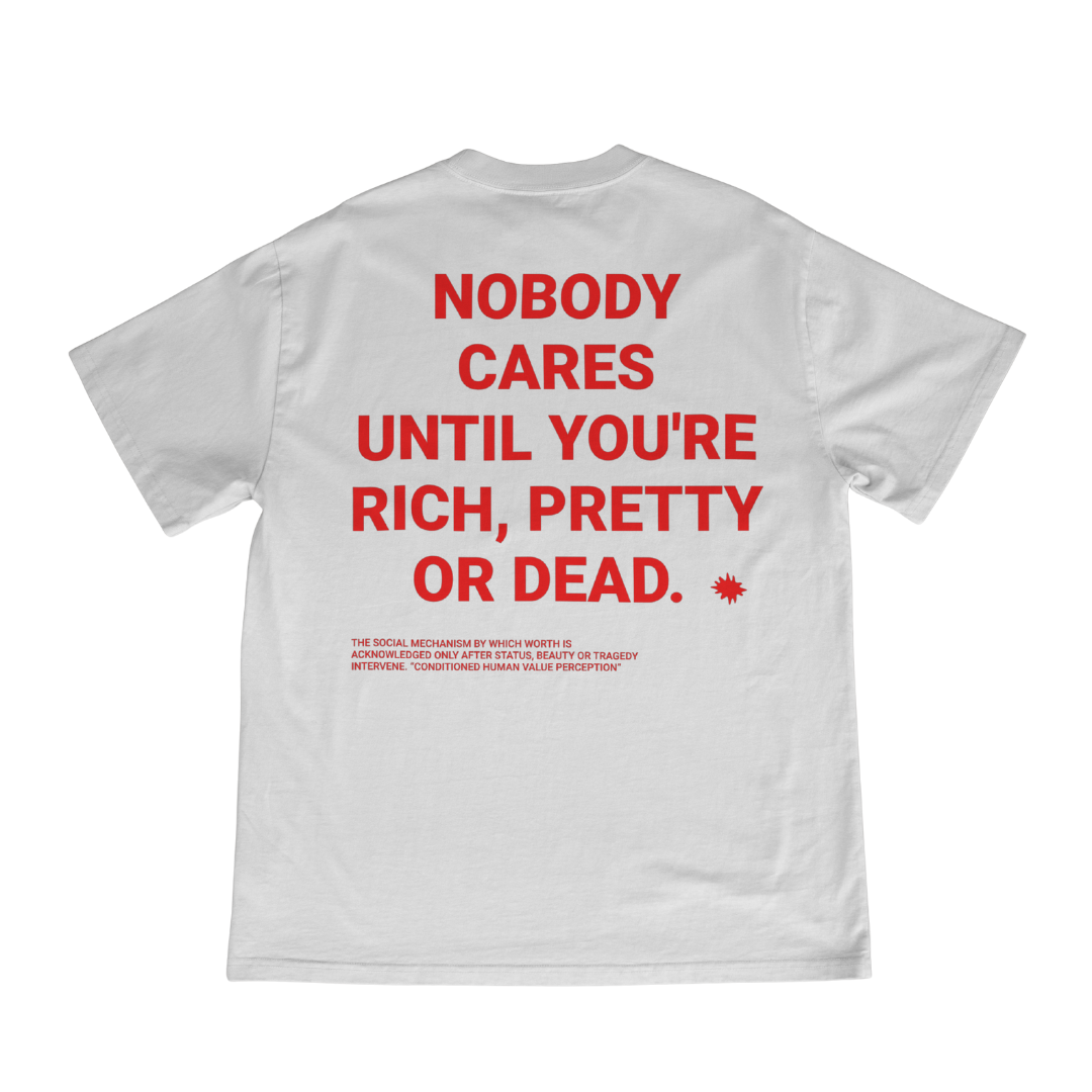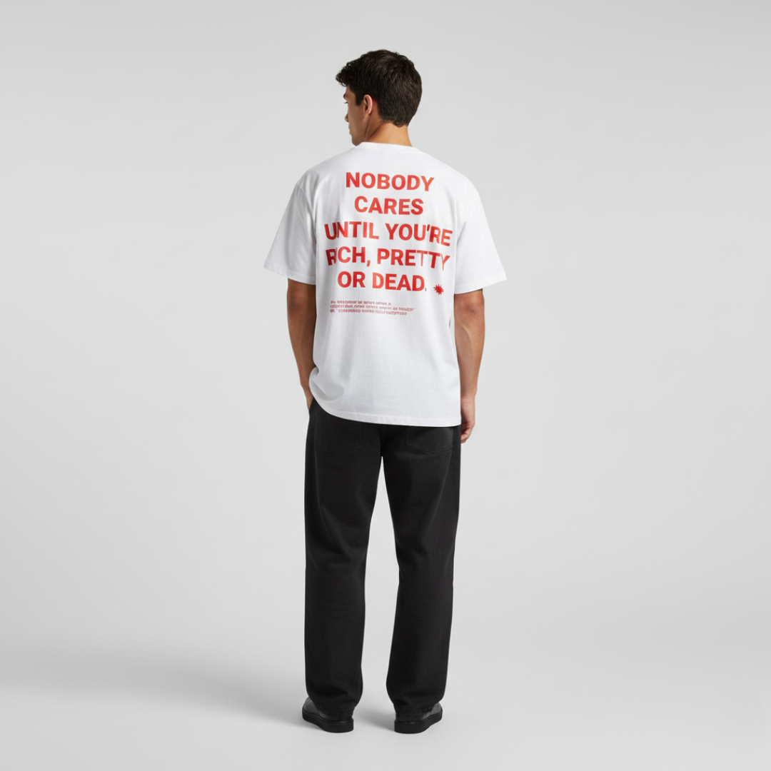 A nossa “Nobody Cares Until You're Rich or Dead” Tee é para quem gosta de dizer as verdades sem rodeios — um statement forte, direto e impossível de ignorar.